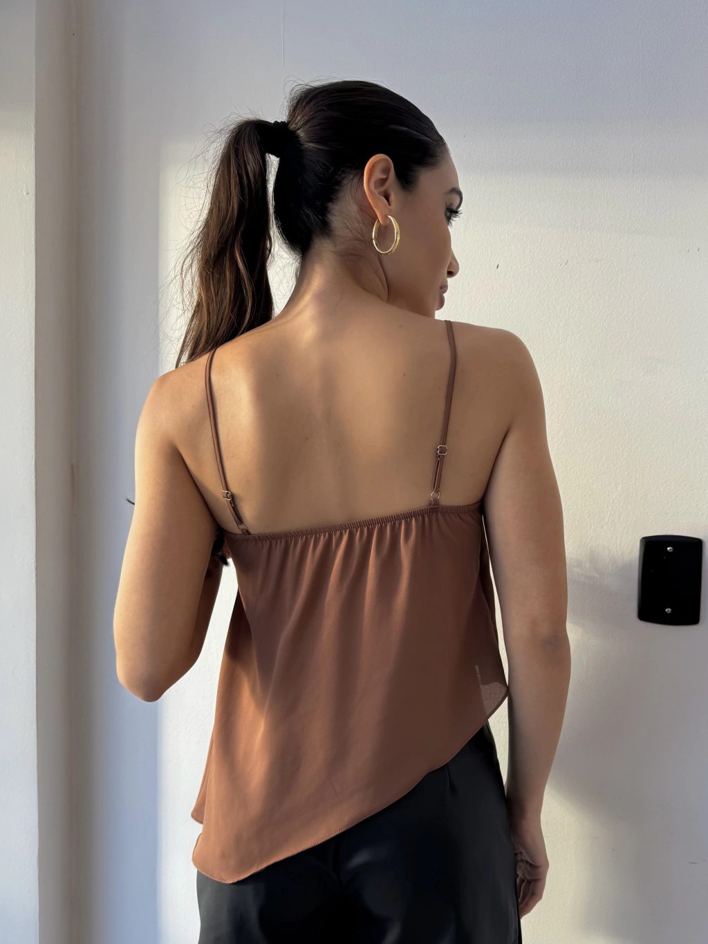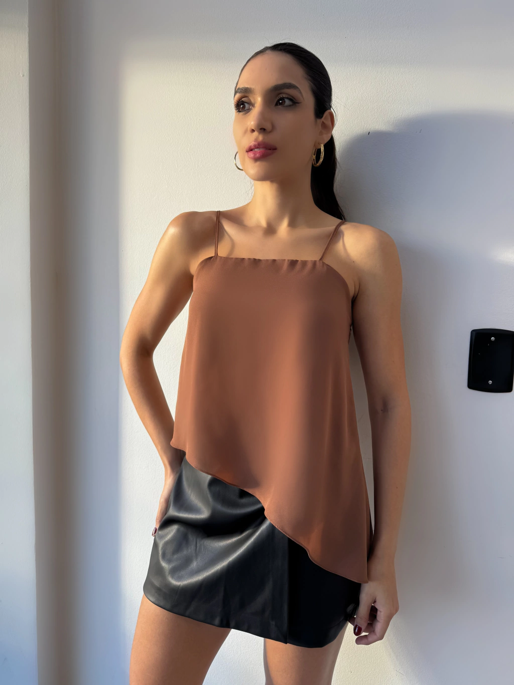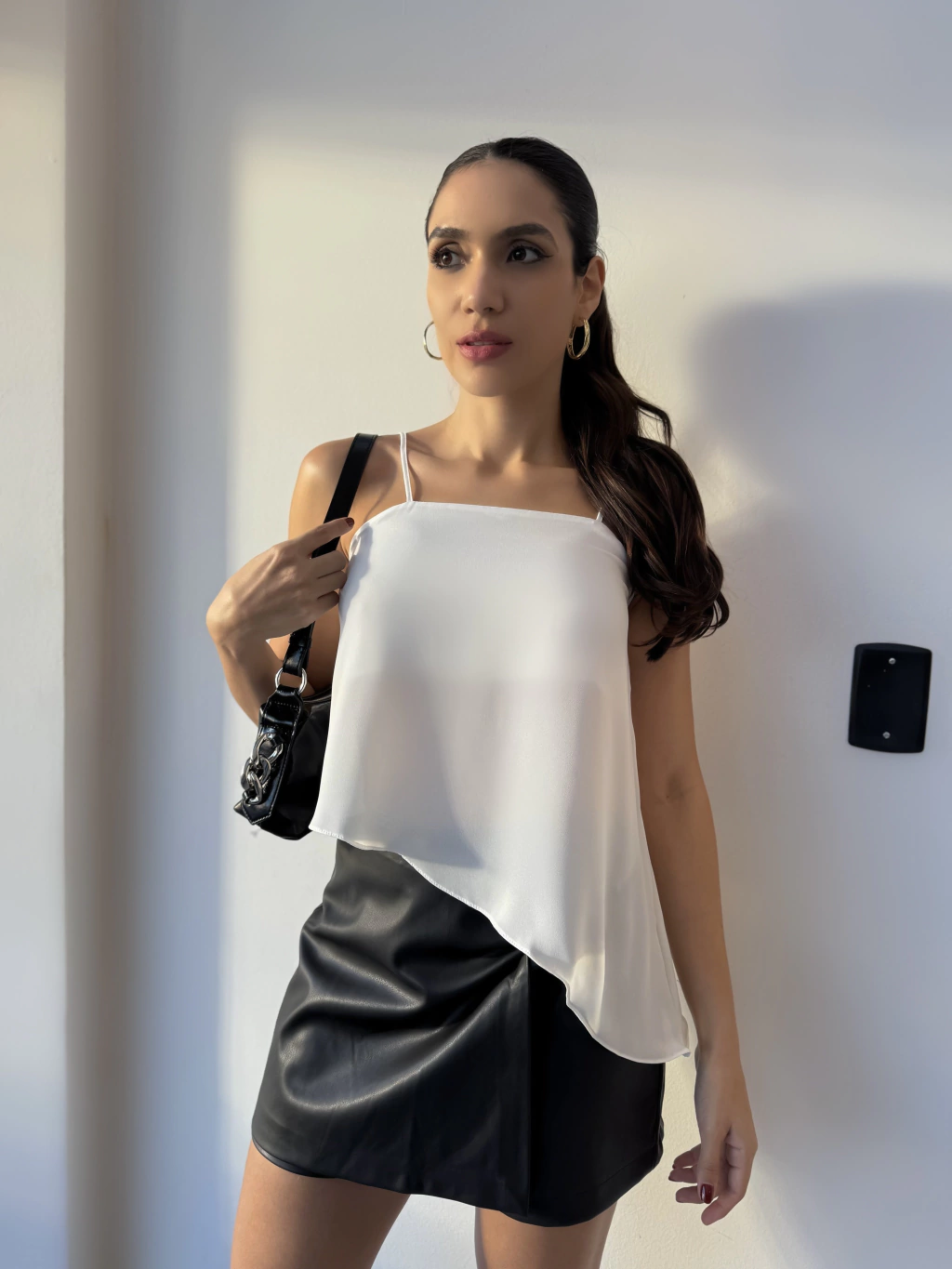 Regata com alças finas e design minimalista, ideal para composições modernas e elegantes. O grande destaque da peça é a barra assimétrica, que confere um toque de originalidade e movimento ao look. Confeccionada em tecido leve e fluido, garante caimento sofisticado e confortável, perfeita para produções versáteis que vão do dia à noite com facilidade.