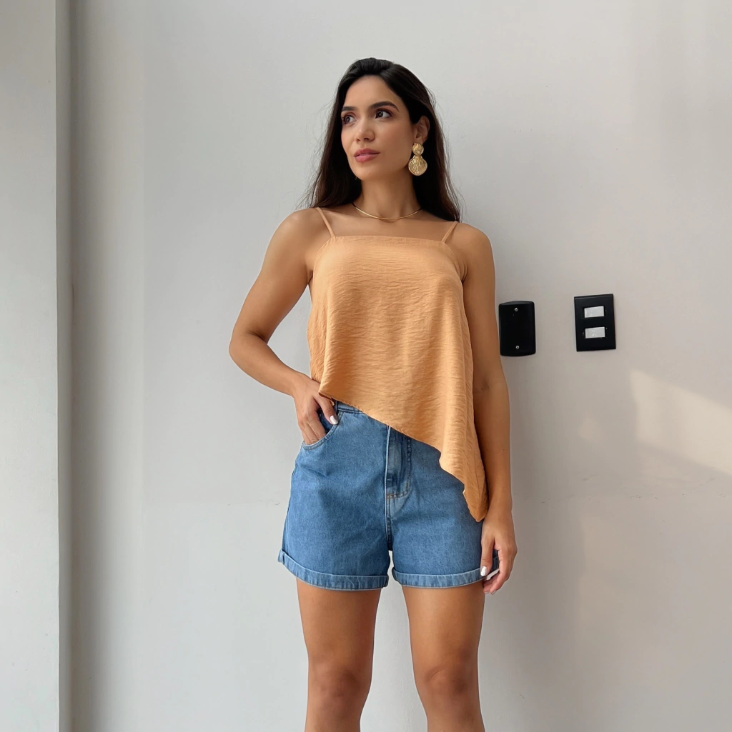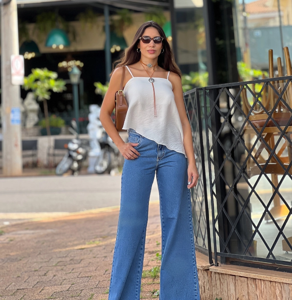 Blusa assimétrica, alça com regulagem confeccionada em viscose e poliamida
