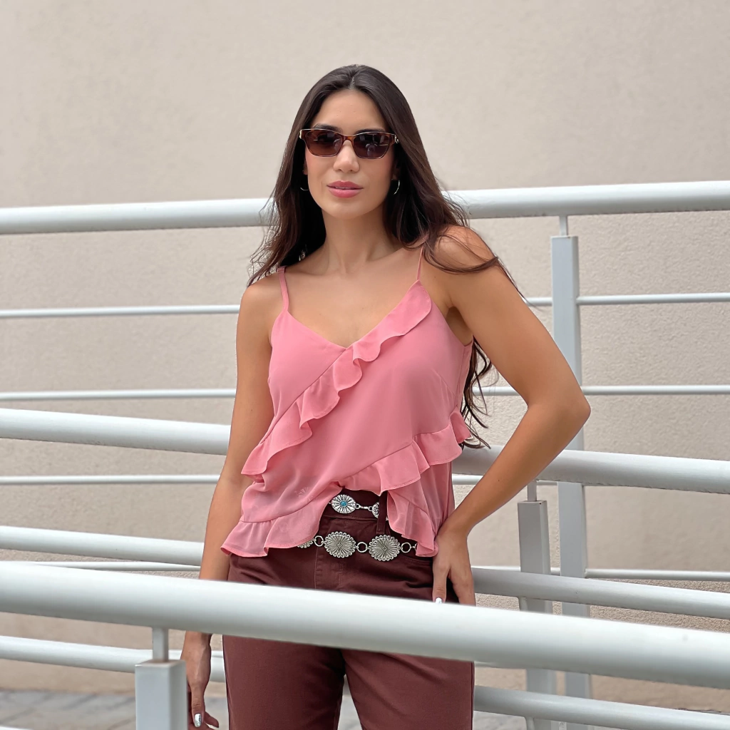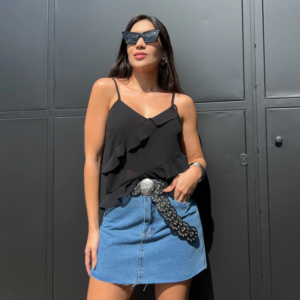 Confeccionada em tecido chifon com uma leve transparencia, peça ideial para compor um look jovem e fashionista.