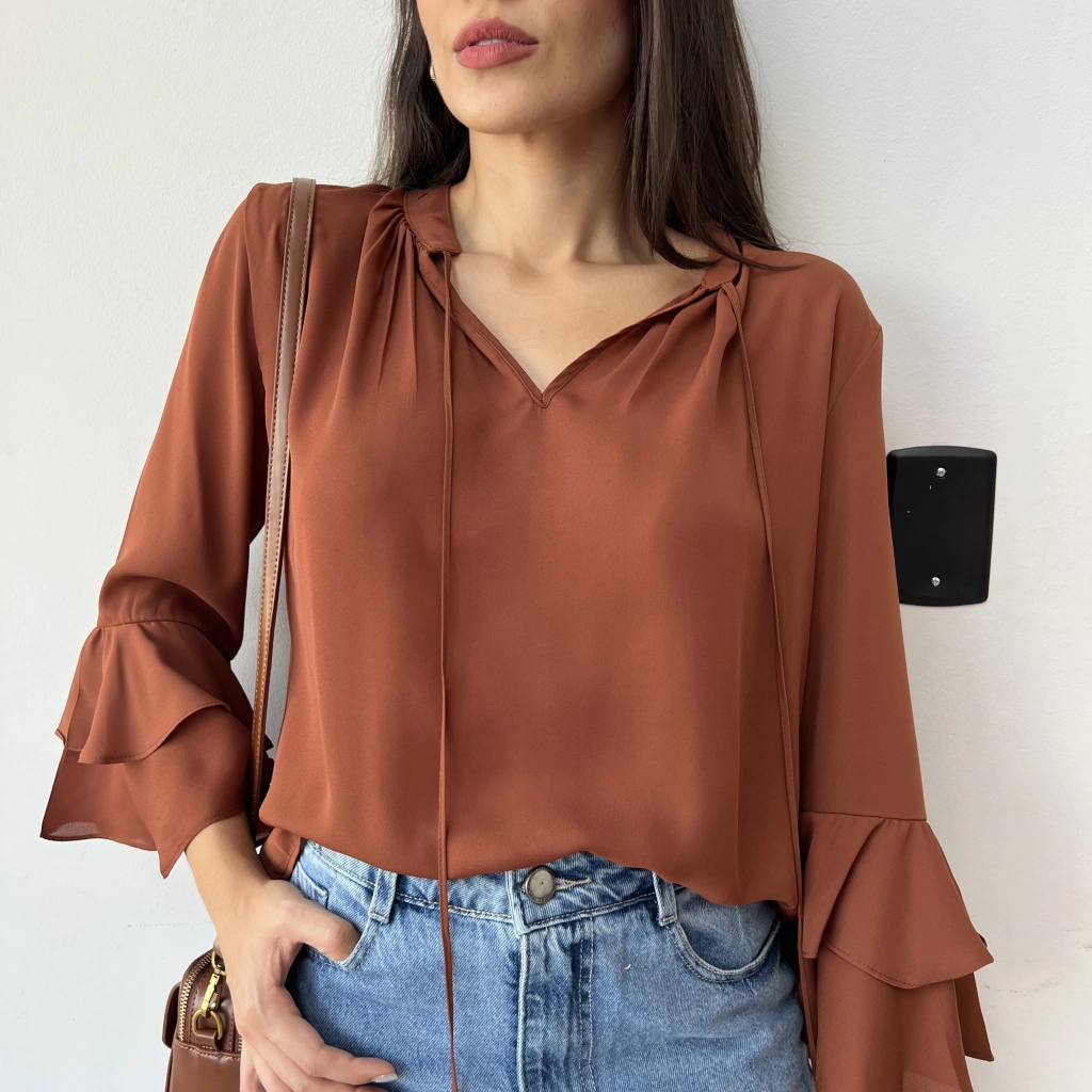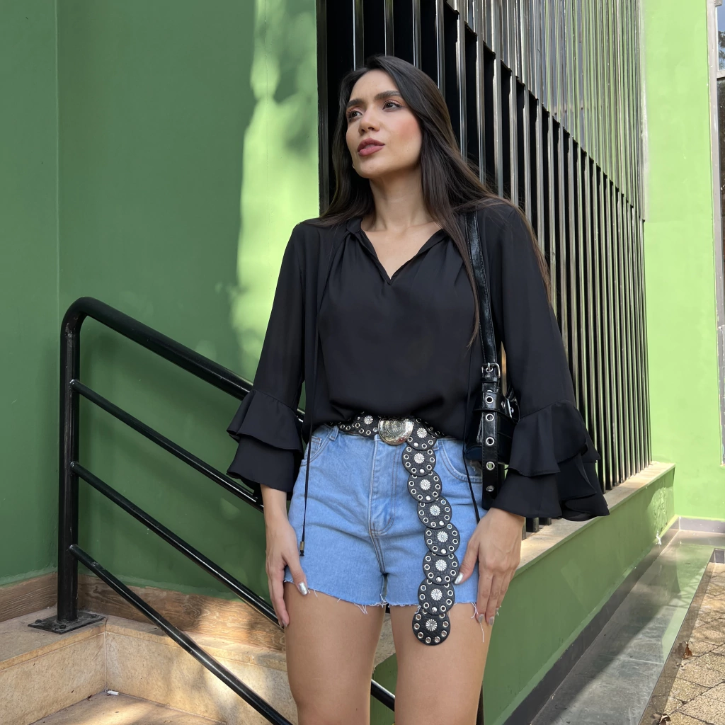 Confeccionada no crepe, a blusa Carol vem cheia de personalidade com os babados na manga para dar aquela estética boho!