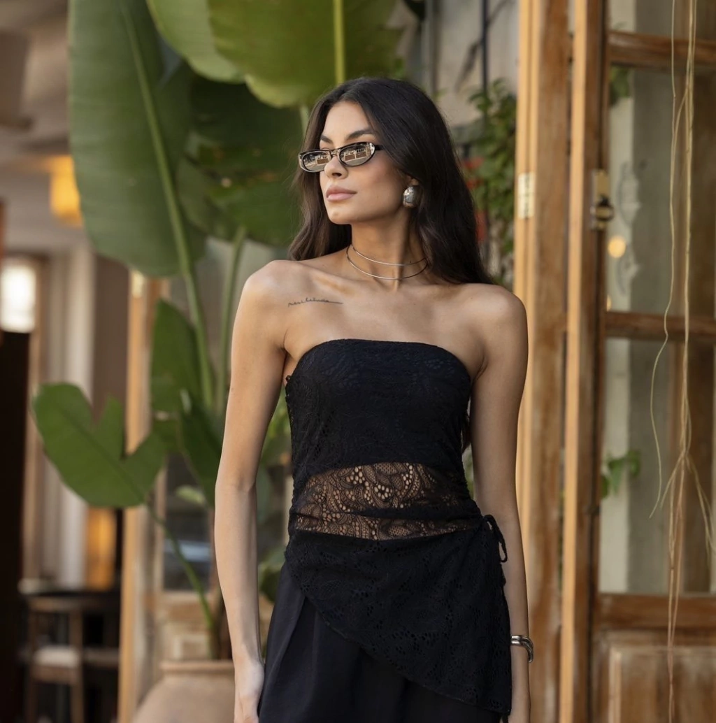 Blusa tomara que caia toda em renda, com uma leve transparencia trazendo leveza e indentidade ao look.