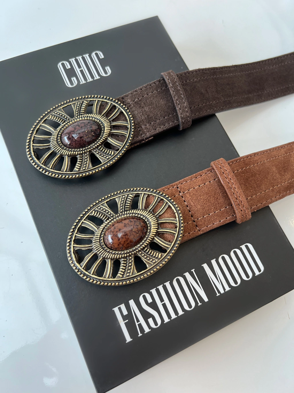 Cinto fivela oval em metal dourado envelhecido, com detalhes vazados. No centro de cada fivela, há uma pedra oval em tom marrom avermelhado com aparência marmorizada, que acrescenta um toque rústico.