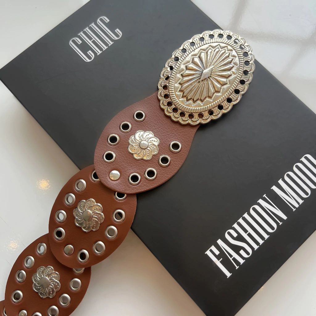 Apaixonada por detalhes que transformam o look! Esse cinto western marrom com aplicações metálicas e fivela trabalhada é a peça-chave que faltava para elevar qualquer produção. Combine com jeans ou vestidos fluidos e arrase no estilo boho-chic!
