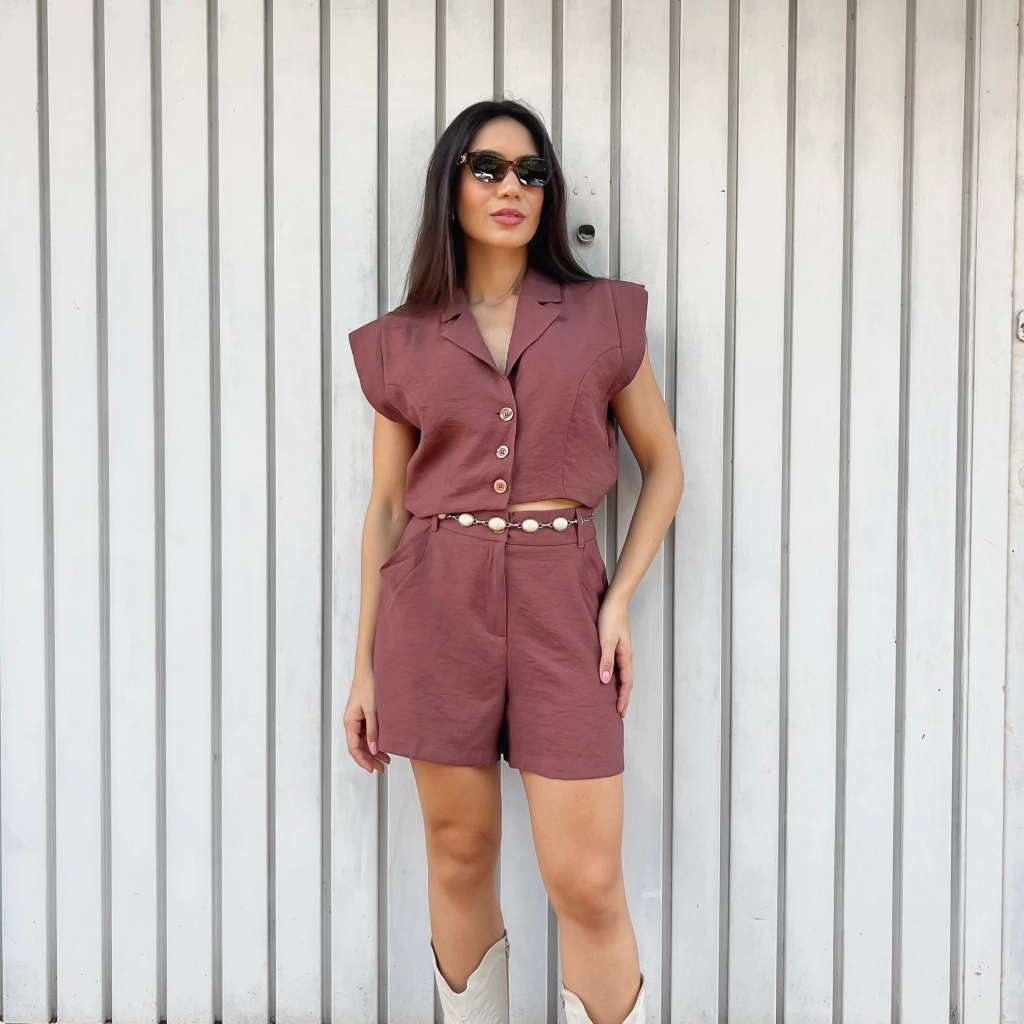 Esse macaquinho é super estiloso e tem uma vibe moderna com um toque elegante. Parece um conjunto, mas na verdade é uma peça unica, daquelas bem versátil!