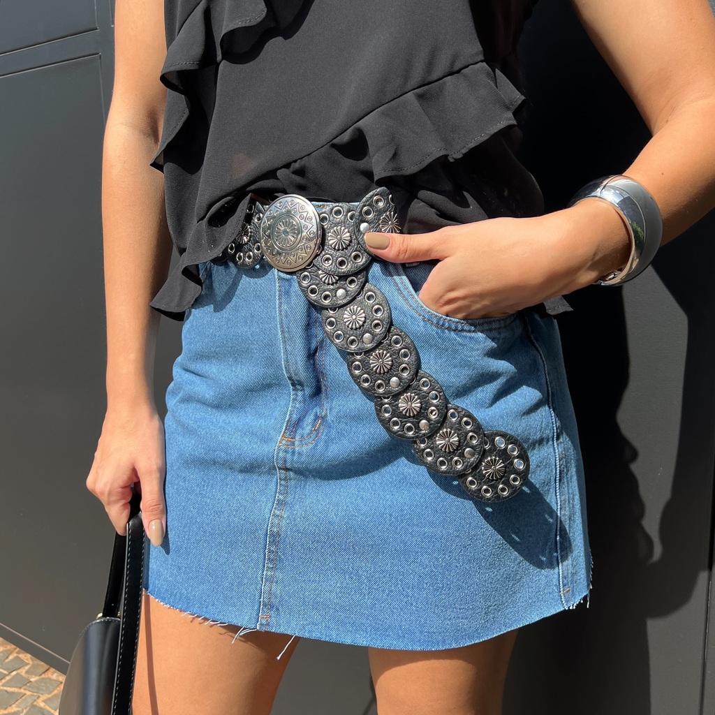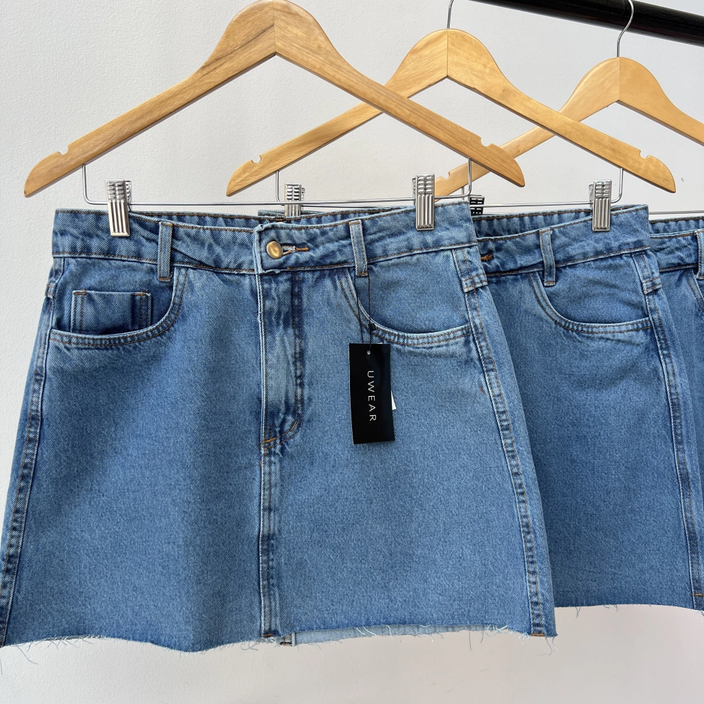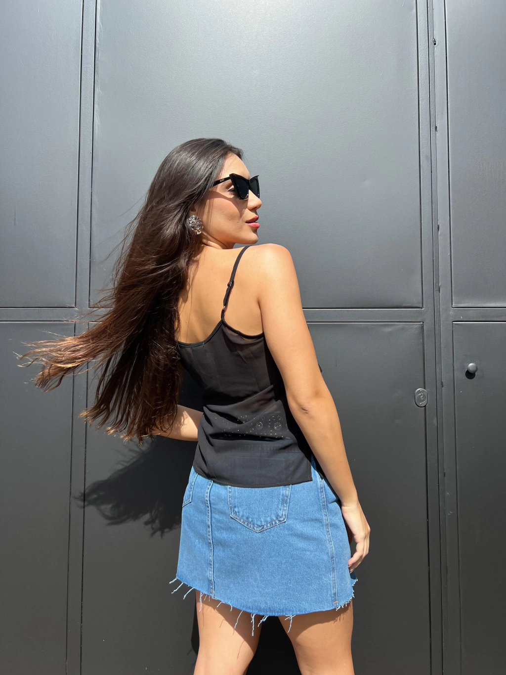 Saia Jeans curta confeccionada em jeans escuro, a peça possui caimento reto perfeita para momentos dispojados e leves do seu dia a dia.