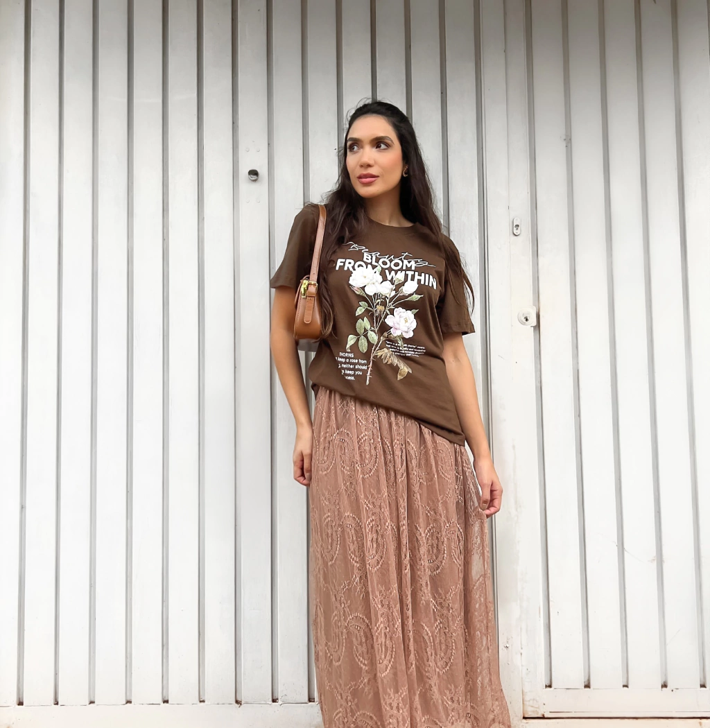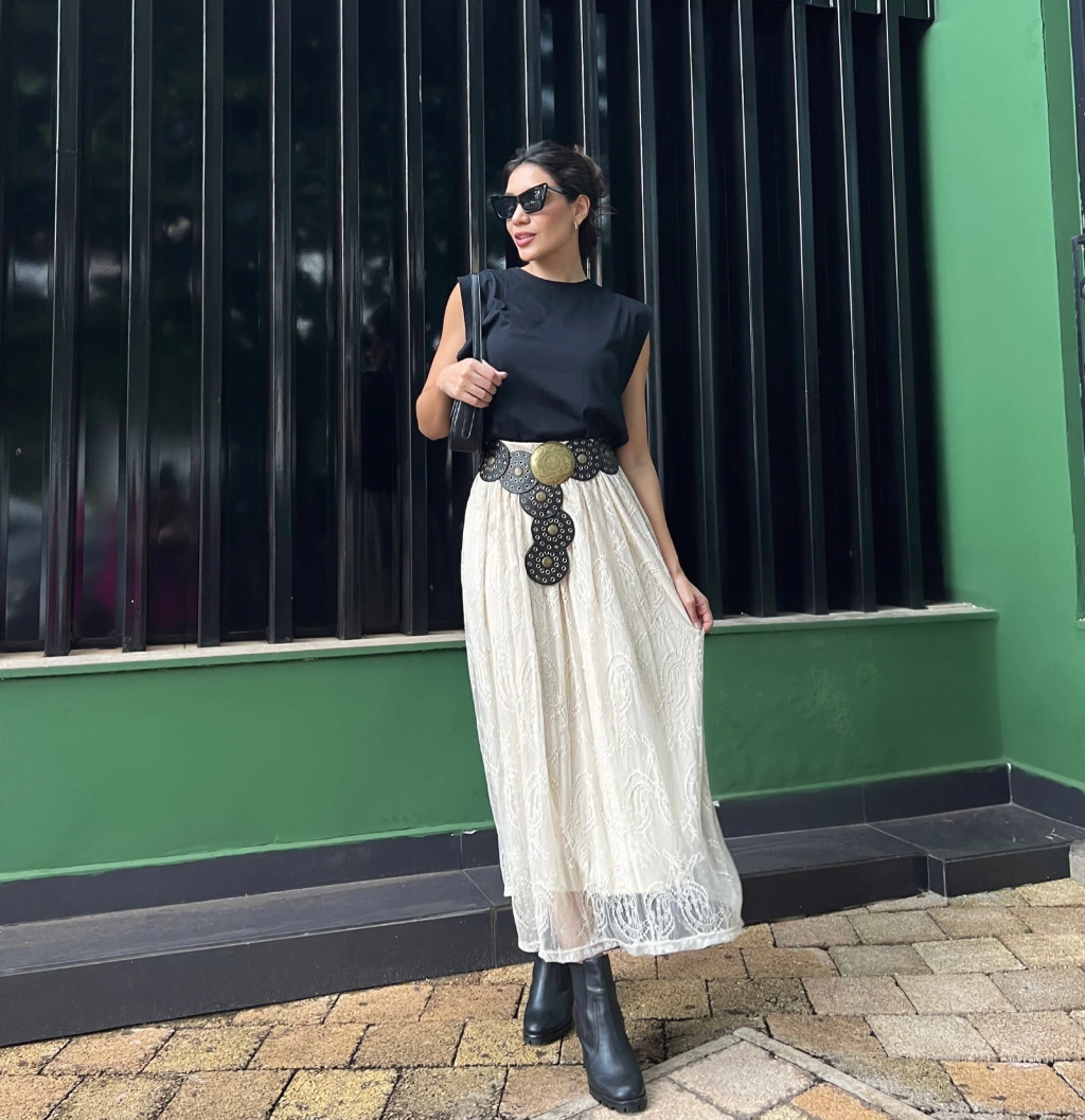 Saia toda rendada com fluidez, perfeita para montar looks com estética boho.