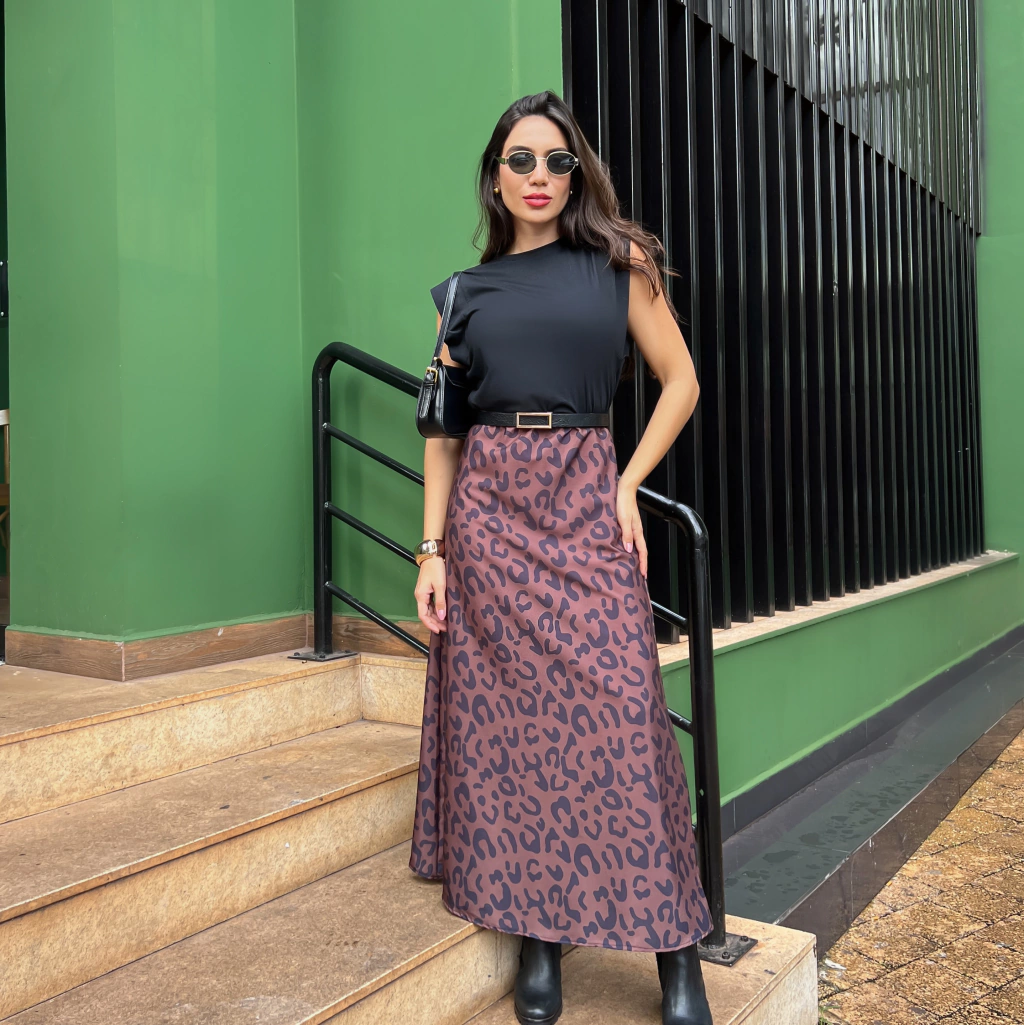A saia tem modelagem em formato A, o que confere um caimento elegante e alonga a silhueta. O tecido tem uma estampa em animal print estilizada em tons de vinho com preto, que da um ar ousado e contemporâneo à composição. É perfeito para ocasiões casuais chiques ou eventos onde se queira transmitir estilo com personalidade.
