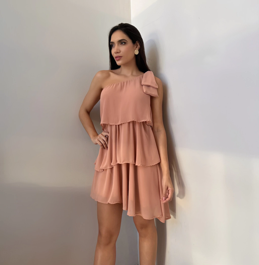 O modelo é curto, com camadas em babado que criam um efeito fluido e leve ao movimento. O detalhe de um ombro só, com um laço aplicado, dá um toque de charme e sofisticação, além de deixar o visual mais moderno e diferente.