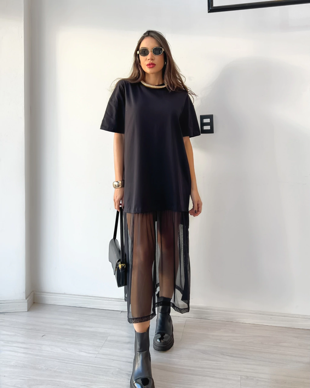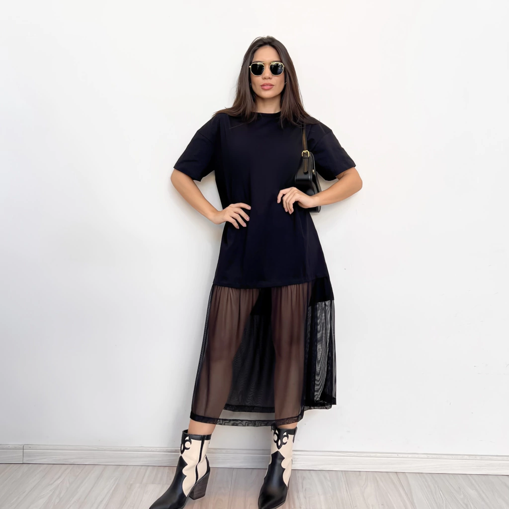 Esse vestido t-shirt com tule traz o equilíbrio perfeito entre o casual e o fashion. A modelagem oversized garante conforto, enquanto a transparência na parte inferior dá aquele toque de ousadia que a gente ama.